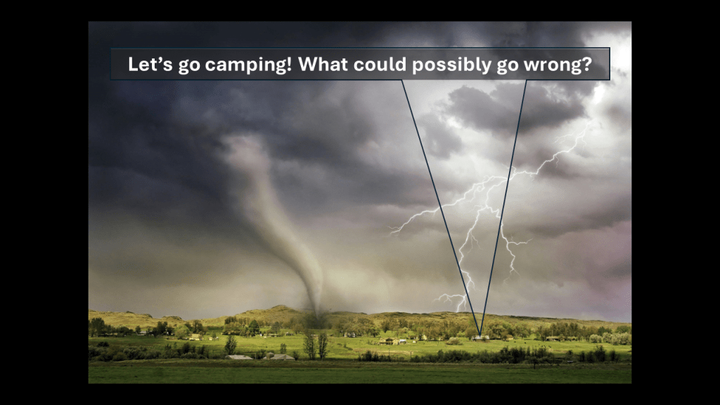 Then, we led the little ones on a hike to the top of Mount Mitchell. Mount Mitchell goes up a lot. It’s the highest mountain east of the Mississippi River, so it takes all day to walk up the mountain. The whole thing seemed pointless to everyone who had to walk up the mountain. It rained most of the walk, but that was nothing compared to the hurricane we enjoyed once we reached the top of the mountain. We couldn’t do anything other than stand, get slammed with sideways rain, and eat soggy marshmallows. It stopped raining after midnight. I could account for all the youngsters. By 2 am, we got everyone set up with tents, started a few fires, and ate something of unknown origin. One of the gang wanted to gather close and have an extended prayer, thanking God for the beautiful time we were having and reminding God there were a whole bunch of sinners He should kill. The campers and counselors said, in unison, “No.” Immediately after, everyone fell asleep in the mud because no one cared anymore.