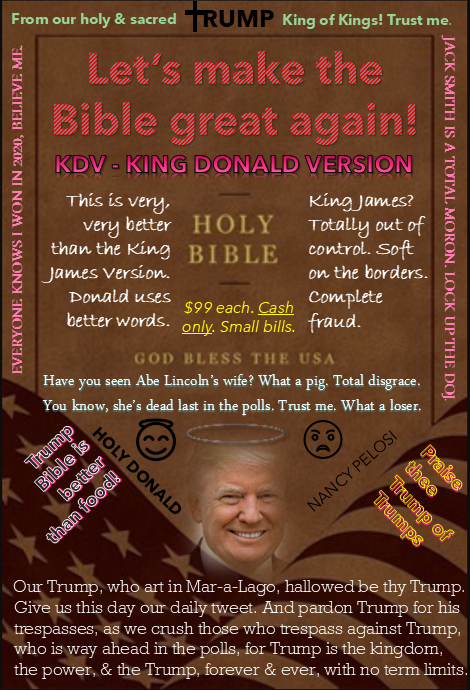 “I pledge allegiance to the Trump of the United Trump of Trump, who is way ahead in the polls. Plus, this whole thing is nothing but a witch hunt. You know it. I know it. And to the Trump, who’s actually really, really tremendous, for which Trump stands. One Trump, under Trump, who won the 2020 election in a landslide, believe me, everyone knows it. Have you seen Jill Biden recently? What a pig. Totally, totally disgusting and way behind in the polls. With Liberty and Trump for all except for that bastard Jack Smith, who’s a complete loser. Very, very horrible person. Way behind in the polls. Give us this day our daily tweet. And deliver us from Liz Cheney, who should be locked up. For yours is the kingdom, and the Trump, and the power, and the Trump, and the glory, and the Trump, who’s better than Jesus when you think about it, forever and ever. And no term limits. AMEN! I mean, TRUMP!”.”