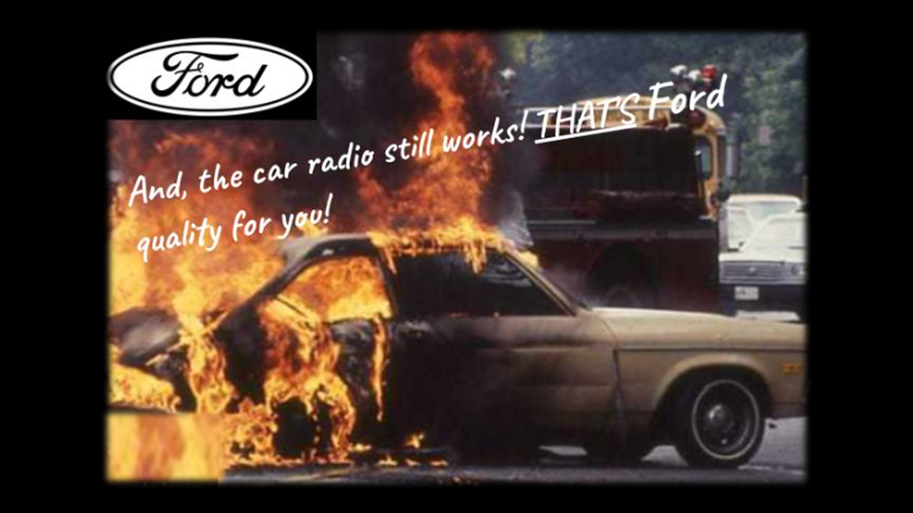 But, what really separated the Pinto from the rest of the field was that if you hit the back bumper of the Pinto at a speed over two miles per hour, the car would instantly catch on fire and, soon thereafter, explode.