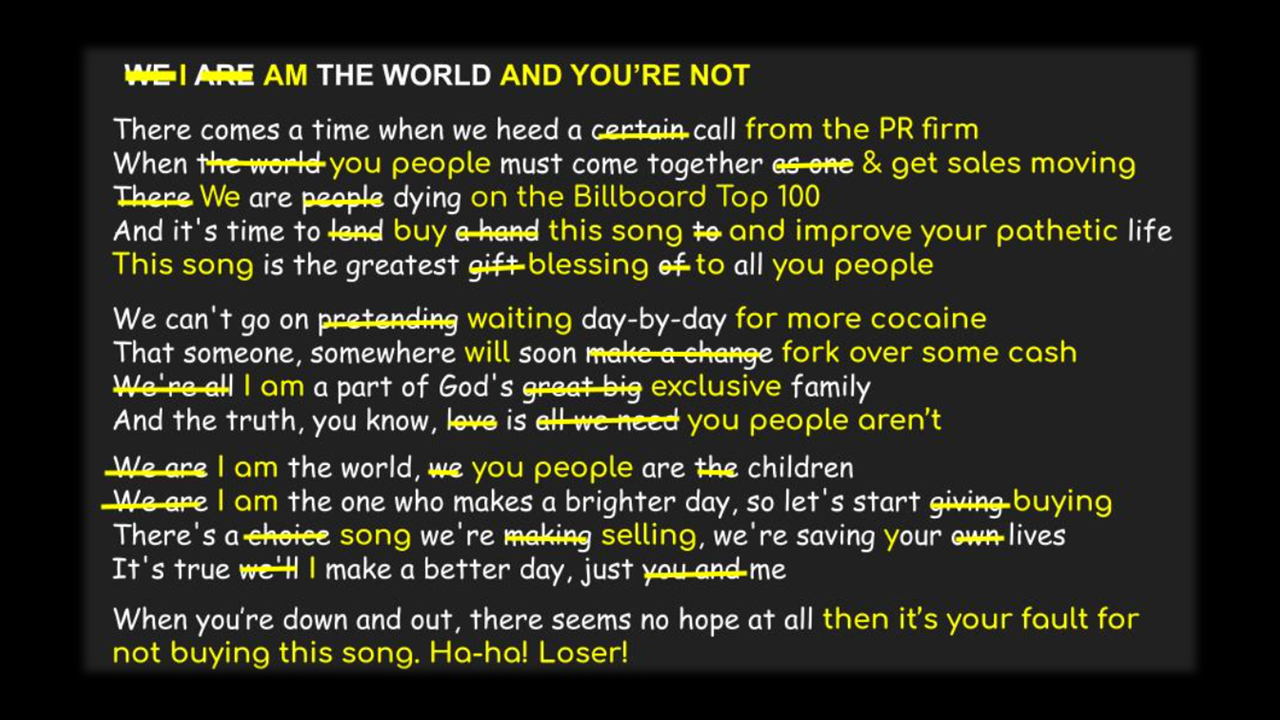 The bad news is the song itself. Think of one of the songs you sang in school when you were six years old. Mix the music with something that could pass as a soft drink jingle. Extend the song to ten minutes, with the final eight minutes dedicated to repeating the chorus. Instead of your classmates singing, bring in a couple of dozen of the most pretentious, self-indulgent, narcissistic, charmless jackasses you can find. Make the lyrics reflect the true sentiments of the songwriters, which was, “Gosh, it is magnanimous of us mega-stars to put down the cocaine and hookers long enough to write about how we, the mega-stars, are carrying the heavy burden of saving the world because we have the spiritual significance you people never will, plus we suffer for our art so you should suffer, too, and we are blessed with the knowledge that the world is blessed by the blessings we have blessed upon you unblessed people by our presence even though you people don’t deserve our blessings so, in a way, we’re a lot like Jesus only better because Jesus didn’t have a six-acre beachfront mansion, so, like, wow, we are courageous by writing a song concerning the poor people of Africa about whom we have no clue except we saw something on TV and we desperately need the publicity so we are gonna keep repeating this annoying chorus until you people give in and claim us as your lord and savior because we’re better than you.”